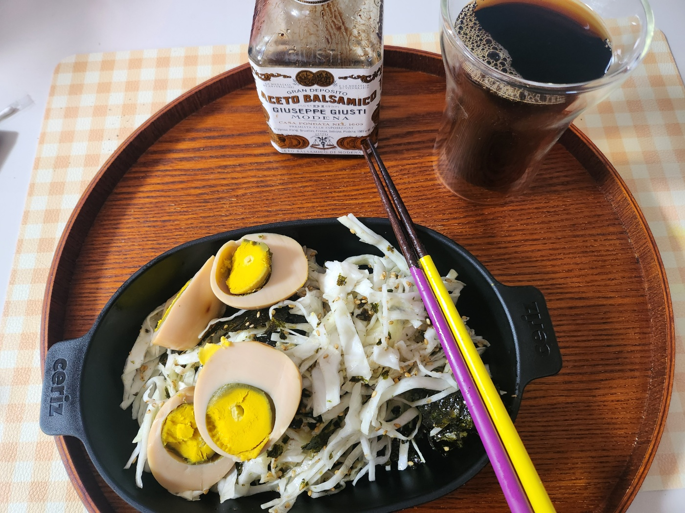 - 삶은 달걀과 양배추채, 김가루, 통깨를 발사믹식초에 살짝 무쳐 한 끼 완성!